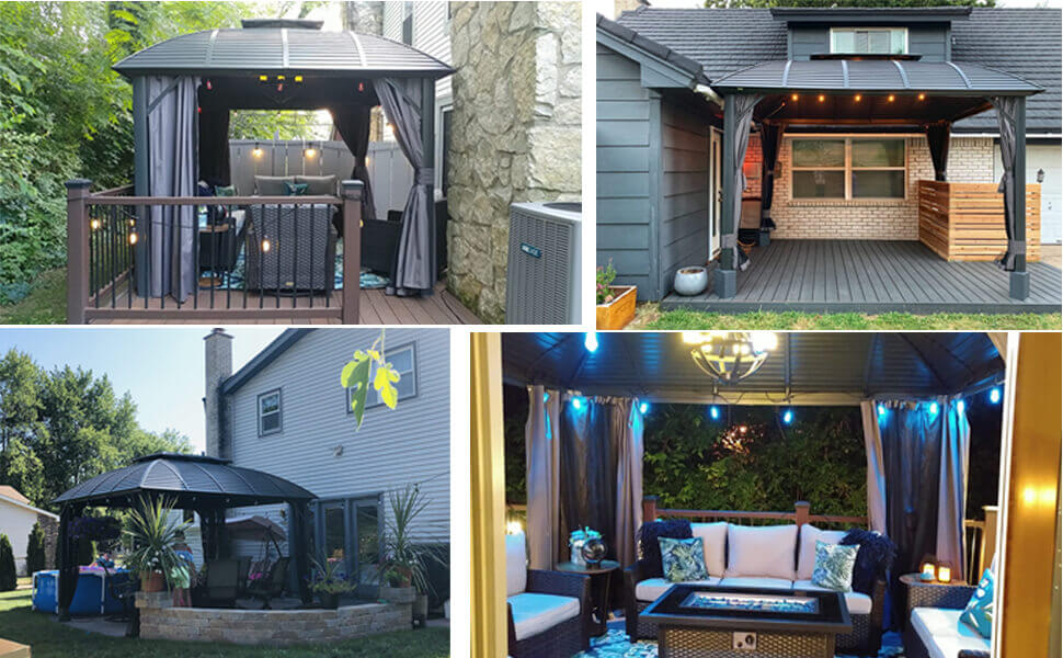 Outdoor gazebo has ventilated double tops, the unique design allows wind to pass through. So don’t worry about cooking fumes when hosting a BBQ party. Hardtop gazebos for patios can tolerate high summer temperatures and withstand UV rays, provides you plenty of cool shade.