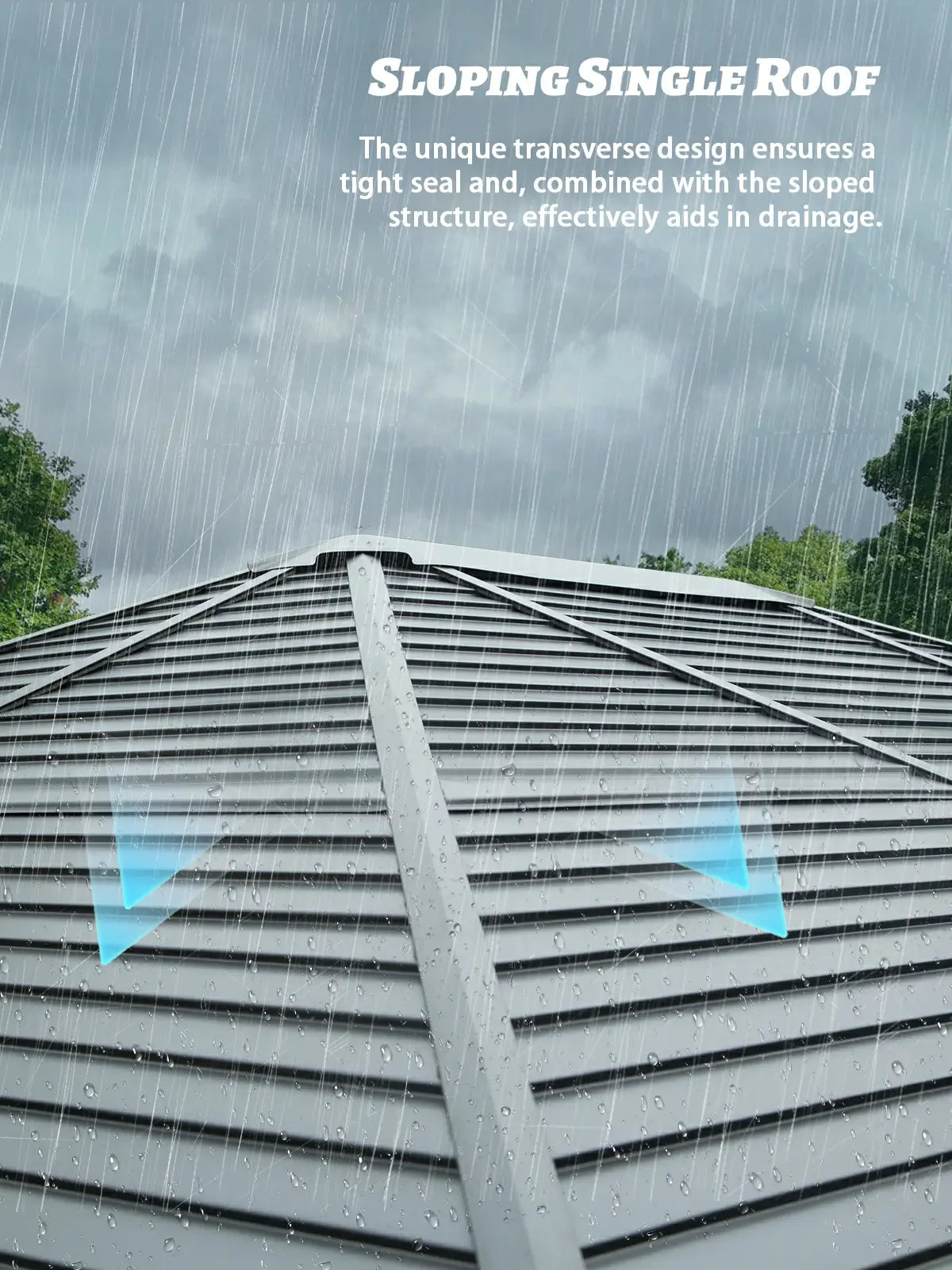 Elevate your outdoor living experience with the Domi sunroom featuring sleek single sloped roof. The unique design not only enhances aesthetic appeal but also provides practical benefits, such as superior water drainage.