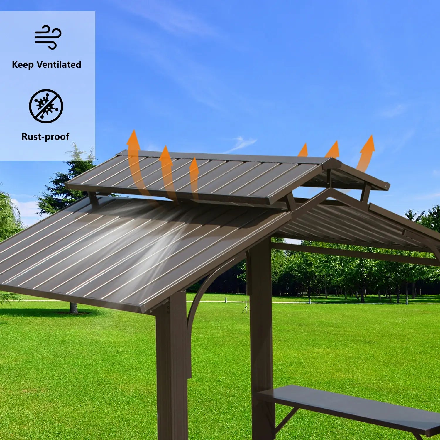 Enhance your outdoor grilling experience with Domi Grill Gazebo, featuring a ventilated double roof for optimal air circulation.The ingenious design enables smoke to dissipate while keeping the space cool and comfortable,ensuring a safe and enjoyable cooking environment. Perfect for year-round use, this sturdy and stylish gazebo is essential for any grill enthusiast aiming to elevate their backyard BBQ setup!
