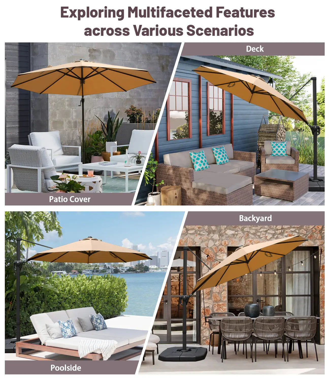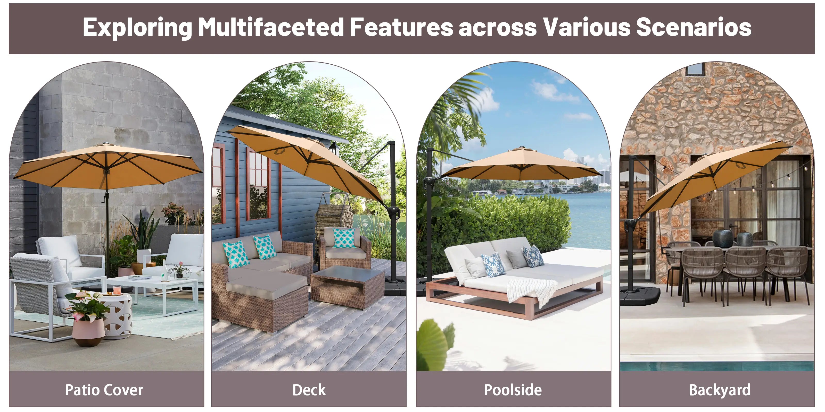 With just a simple adjustment, you can customize the angle of the deck umbrella to block the sun from any direction, ensuring maximum comfort as the day progresses. Whether it's morning, noon, or late afternoon, your outdoor space will remain cool and comfortable under this versatile cantilever patio umbrella.
