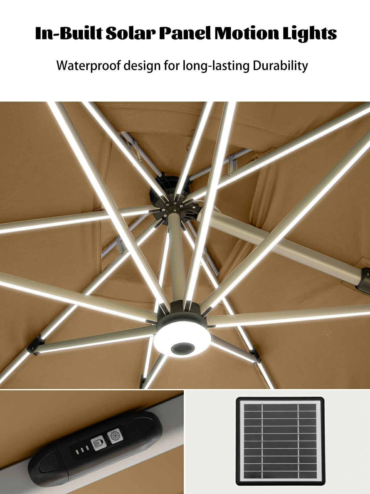 Equipped with a solar-powered charging battery switch, Domi cantilever outdoor umbrella harnesses solar energy to illuminate your outdoor space with soft, eco-friendly light, extending your outdoor gatherings well into the evening.
