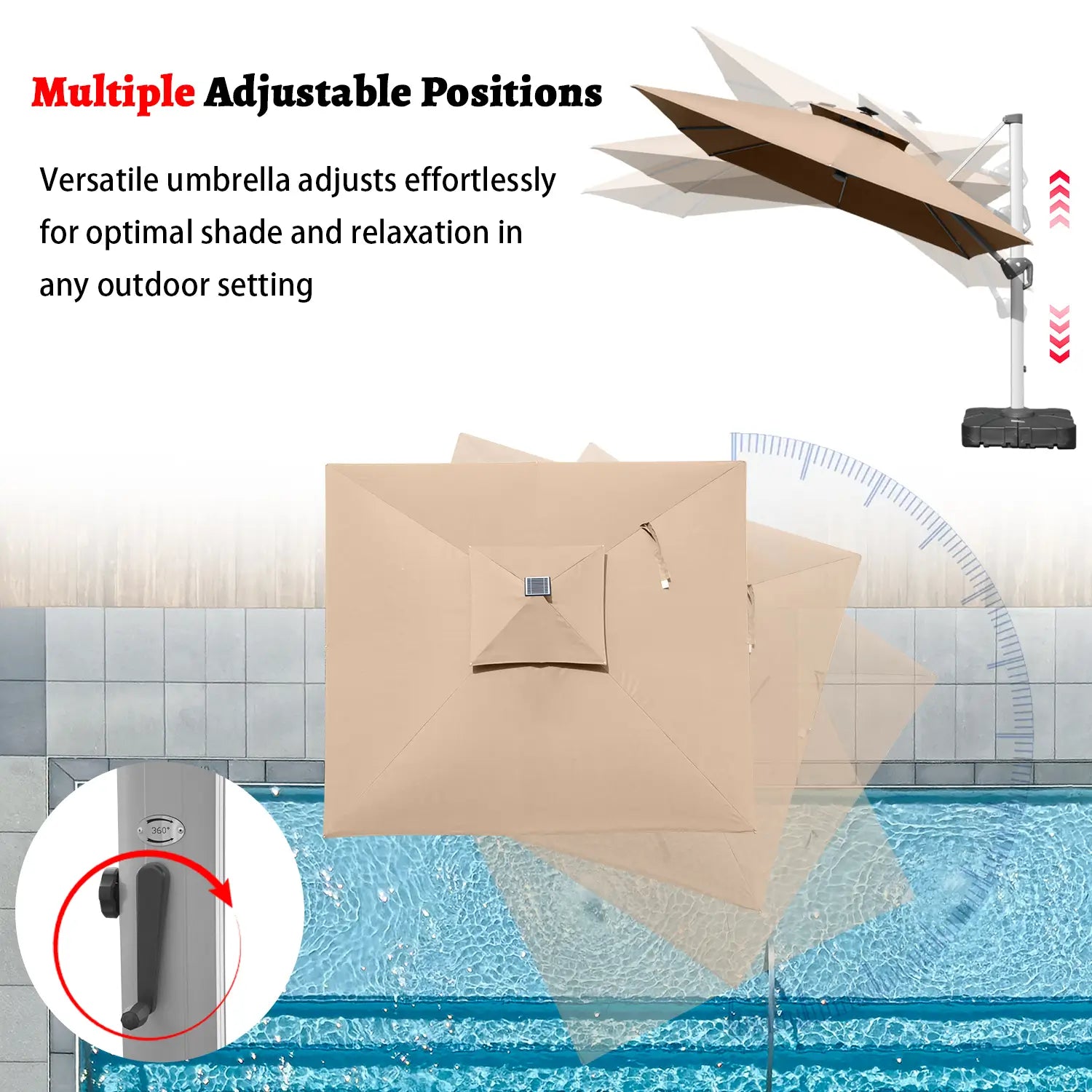 Experience unparalleled versatility with the Cantilever Patio Umbrella's ability to rotate a full 360 degrees. Adjust the umbrella to your desired angle effortlessly, providing optimal shade at any time of day.