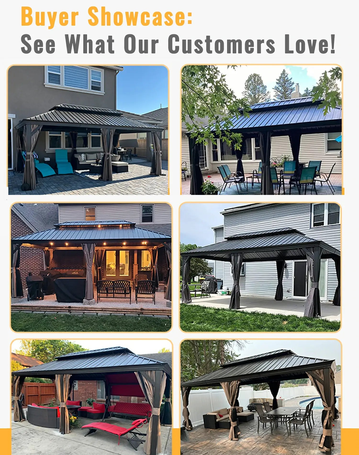 UV protection Roof, the Domi Outdoor Living Hardtop Gazebo shields you and your loved ones from harmful sun rays, allowing you to relish in the great outdoors without worry. Experience the allure of the double top design, providing not only exquisite aesthetics but also unparalleled functionality. The innovative design facilitates optimal ventilation, allowing refreshing breezes to caress your skin during warm summer days. Feel the cool, gentle wind as it dances through the gazebo, creating a serene ambiance that beckons you to unwind and relax.