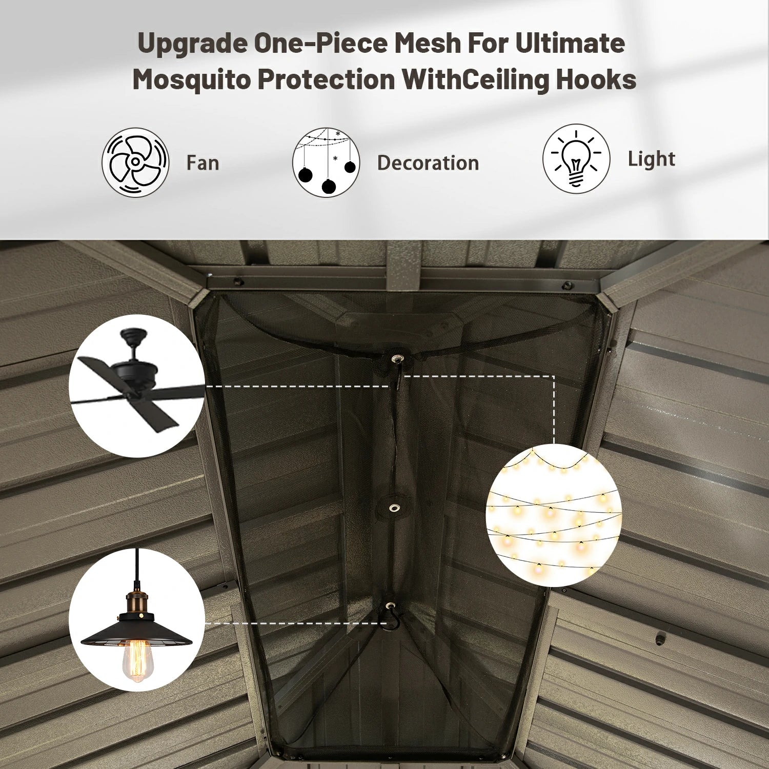Stay protected with our hardtop gazebo featuring an upgraded one-piece mesh for superior mosquito protection. Designed for versatility, the built-in ceiling hooks let you easily add a fan, lighting, or decorations, creating a stylish and comfortable outdoor retreat. Perfect for day and night enjoyment!