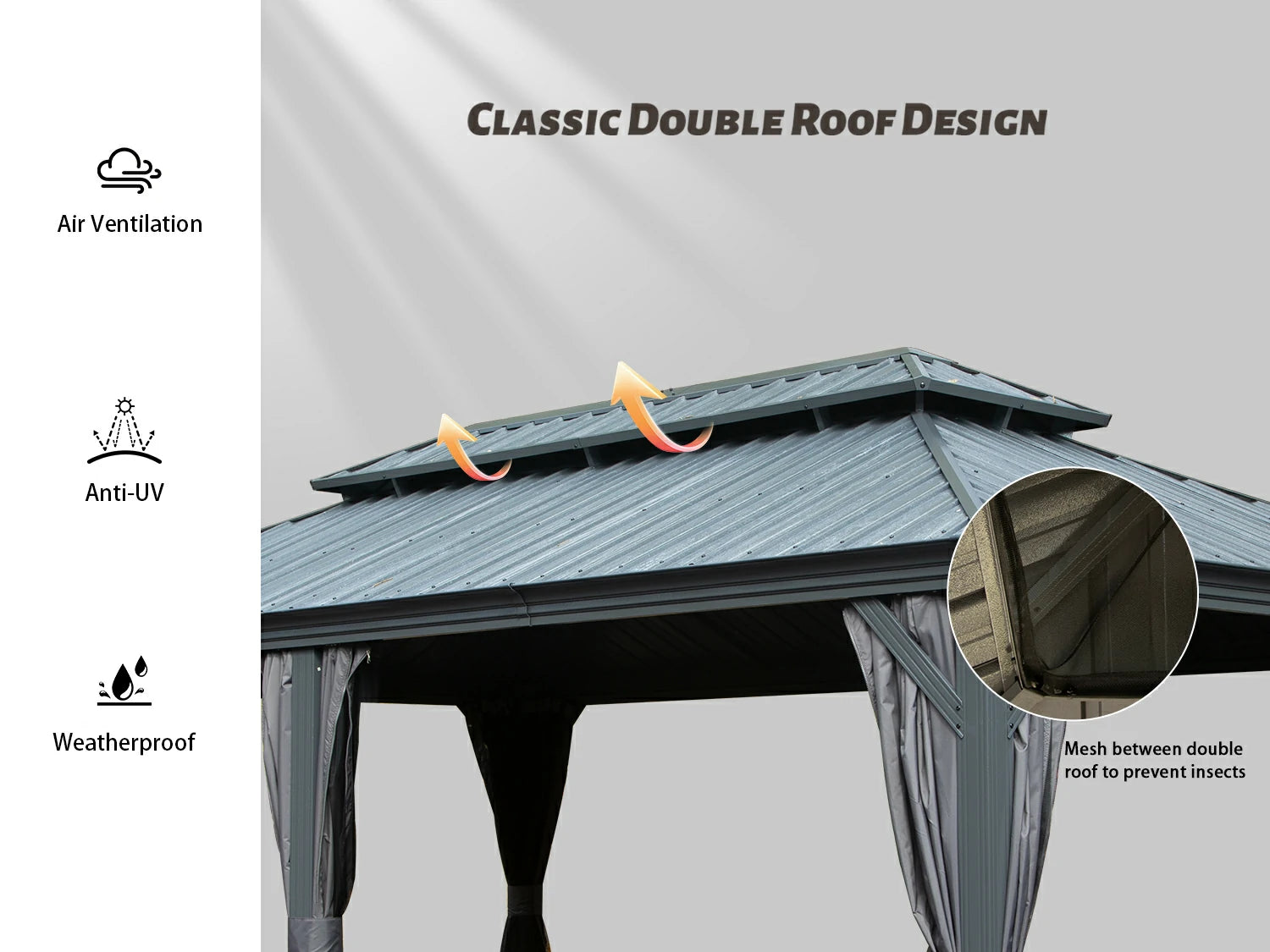 Our hardtop gazebo features a double roof design for enhanced airflow, UV protection, and weather resistance. A built-in mesh layer keeps insects out while allowing fresh air to circulate, creating a comfortable and bug-free outdoor space.