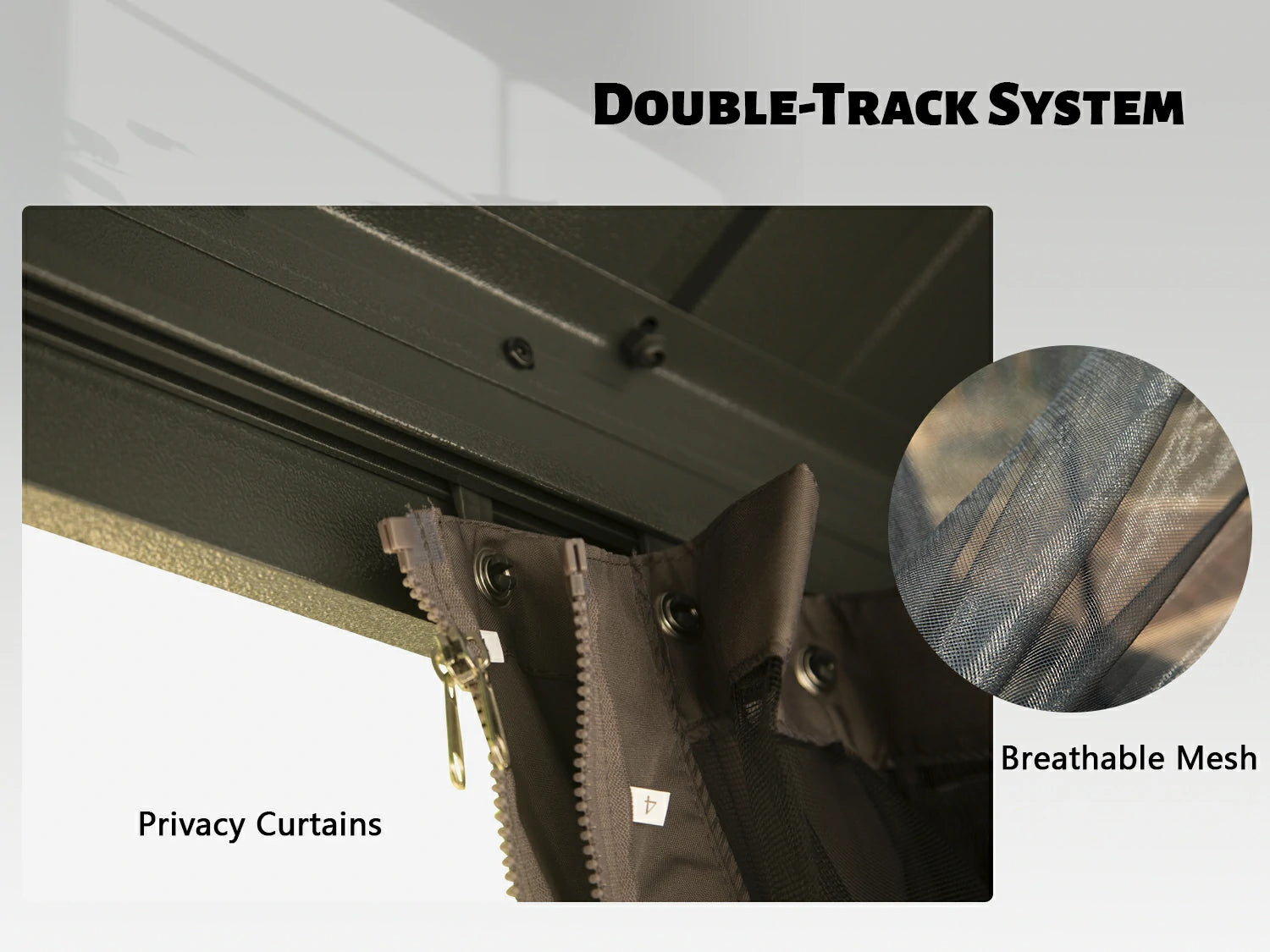 Our hardtop gazebo features a double-track system, allowing you to use both privacy curtains and breathable mesh simultaneously. Enjoy shade, airflow, and protection from insects while maintaining your desired level of privacy.