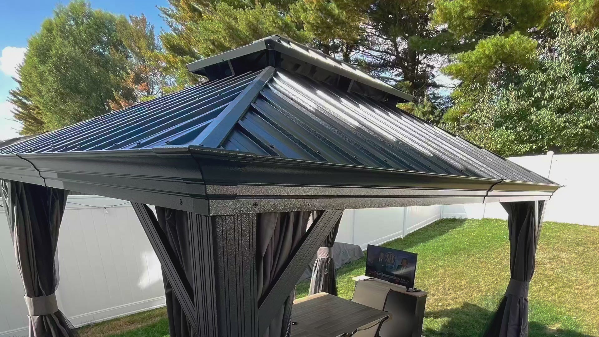 This exquisite structure combines timeless elegance with unmatched protection, allowing you to indulge in the beauty of nature while sheltered from the elements. Whether you seek a tranquil space for relaxation or a stunning venue for outdoor gatherings, this gazebo is the perfect addition to your home.
