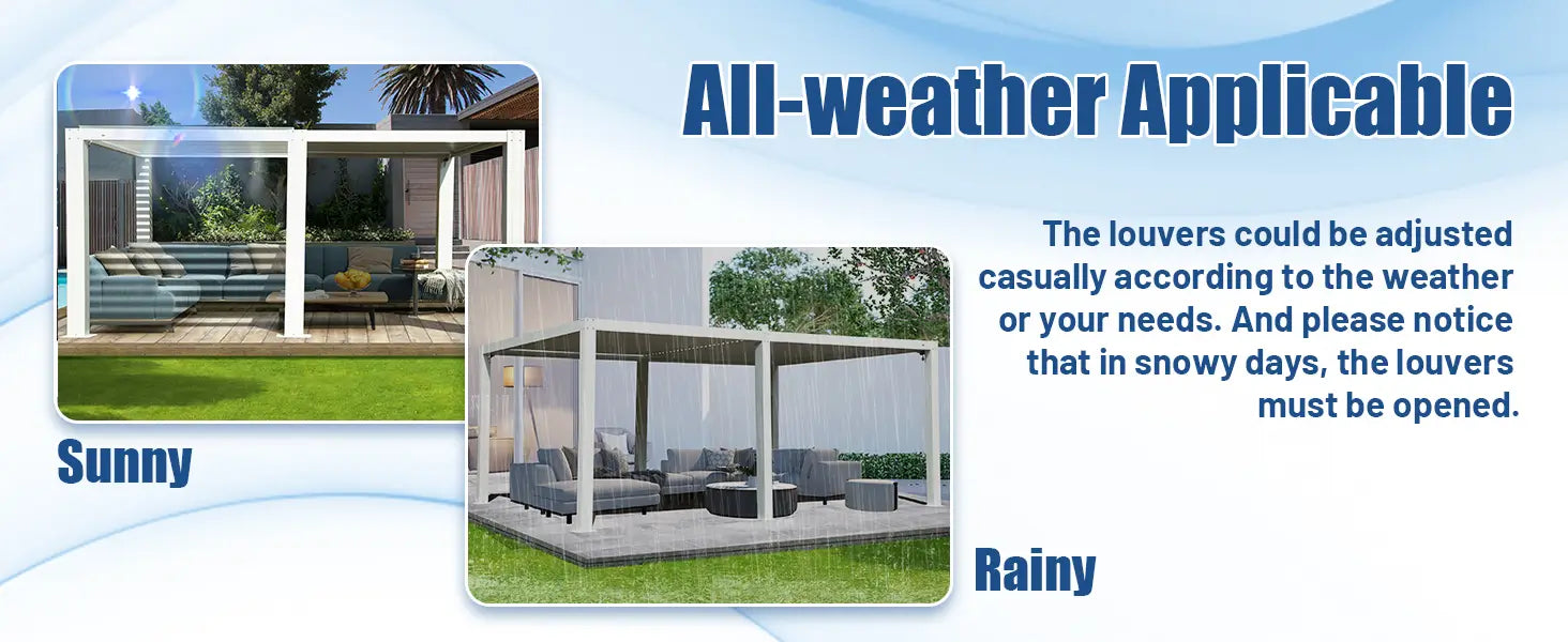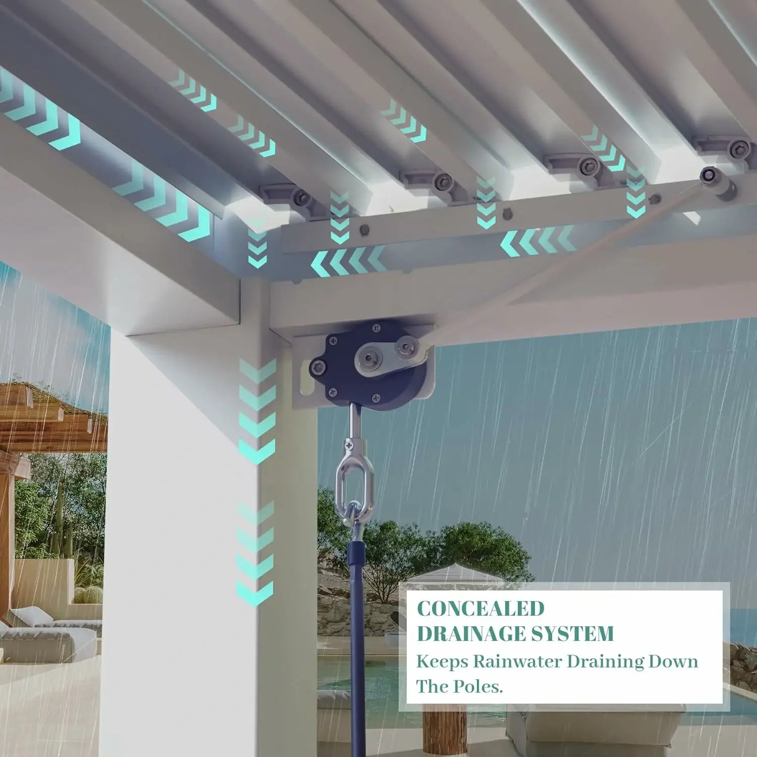 Expertly constructed from premium-grade, all-aluminum materials, it ensures unwavering durability, allowing you to enjoy your outdoor oasis for years to come. With a built-in gutter system that efficiently manages rainwater runoff, you can rest easy knowing your pergola will remain pristine, regardless of the weather conditions. Elevate your outdoor living space with the Domi louvered pergola and indulge in the beauty of nature, free from worry.