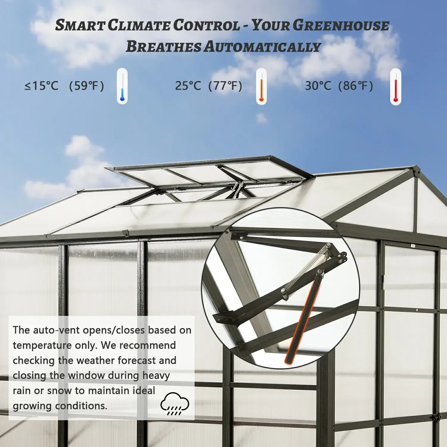 Revolutionize your cultivation process with the Domi automated greenhouse, where effortless plant care becomes reality. This premium structure boasts automatic ventilation, making it incredibl yuser-friendly and highly effective. Its integrated auto-vent system constantly monitors internal temperature, adjusting roof vents to ensure your plants receive ideal fresh air and temperature moderation. Choose Domi Outdoor Living for a reliable, intelligent greenhouse solution that simplifies year-round growing and guarantees a thriving environment for all your garden favorites.