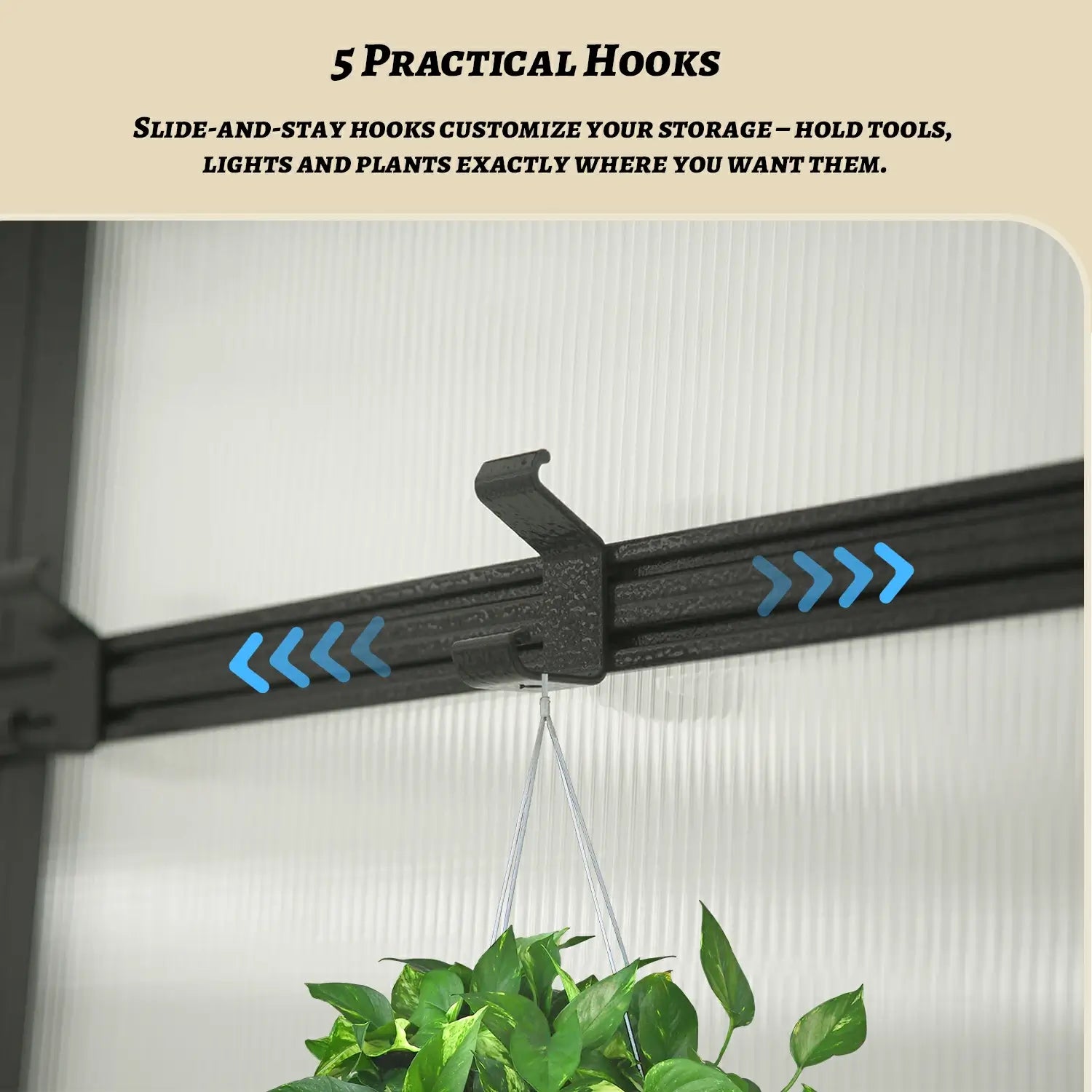 Unleash Domi greenhouse's full potential with 5 practical slide-and-stay hooks. These innovative hooks offer customizable storage, perfect for hanging gardening tools, grow lights, and hanging plants exactly where needed. Say goodbye to clutter – keep everything organized and accessible. This smart storage solution optimizes your greenhouse space, enhancing efficiency and making gardening tasks more enjoyable. Experience a truly personalized, well-organized growing environment with Domi's high-quality greenhouse accessories.