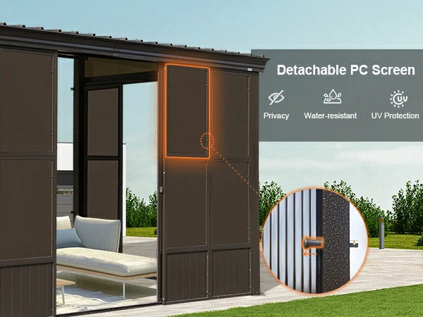 Additionally, the removable PC Panels offer the flexibility to create an open-air ambiance or shield you from pesky bugs, making it the perfect sanctuary for relaxation and entertainment. Enjoy the perfect blend of style and security while effortlessly transitioning between your cozy indoor space and the beauty of the outdoors.
